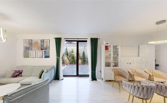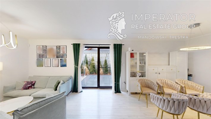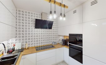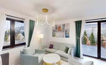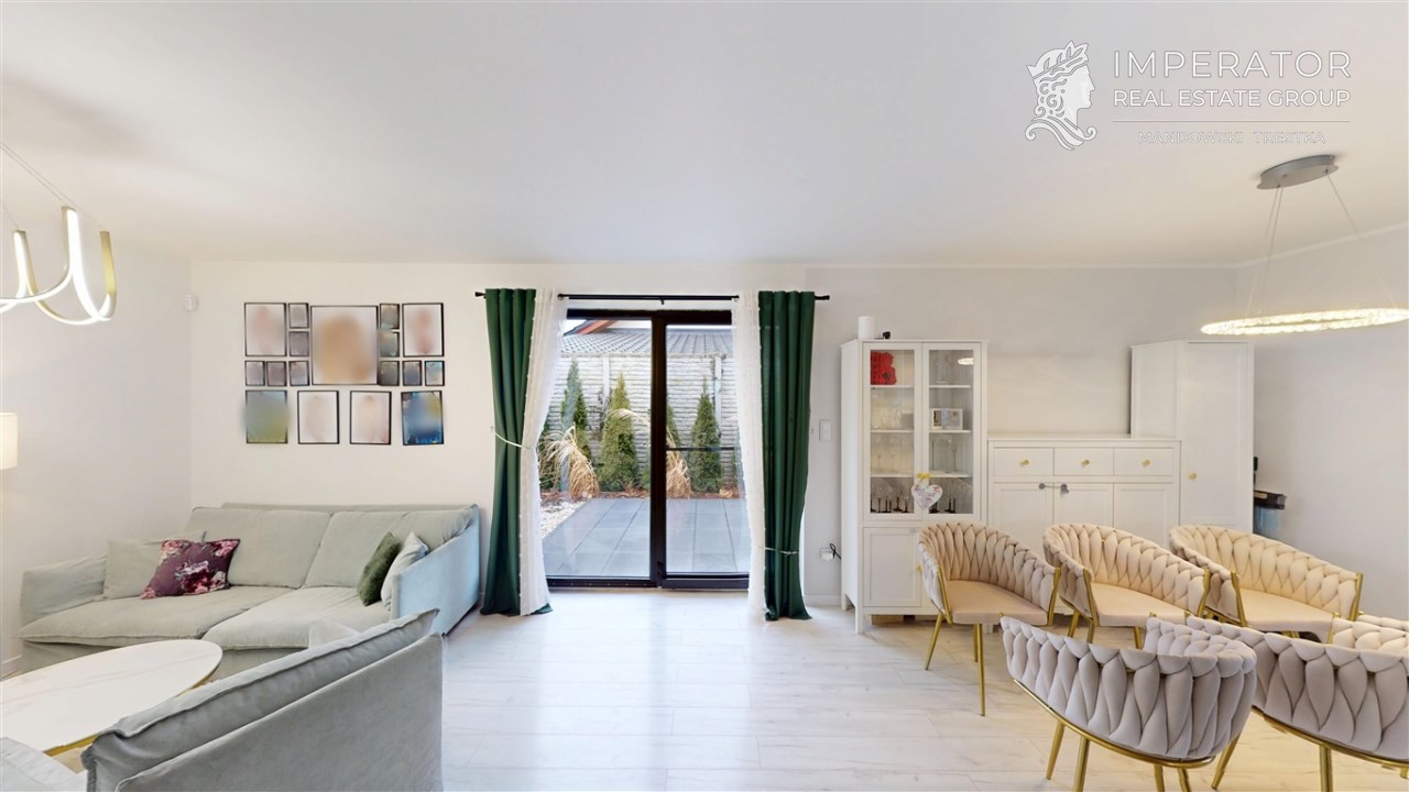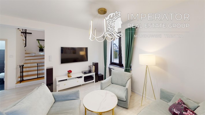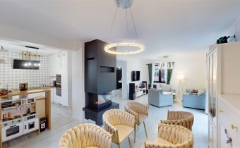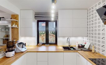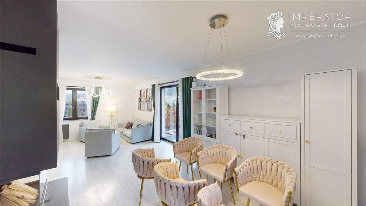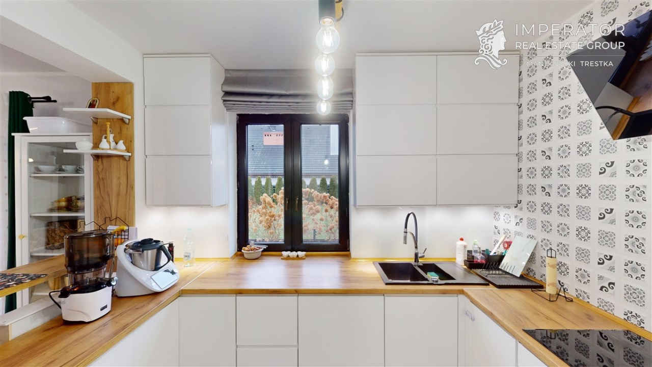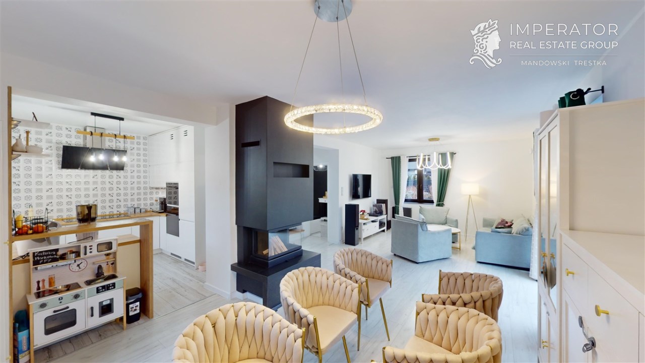 - SALON Z JADALNIĄ I KUCHNIĄ - serce strefy dziennej. Otwarta przestrzeń dobrze doświetlona, z możliwością wyjścia na taras. W salonie znajduje się kominek idealny na długie zimowe wieczory. Kuchnia w prawdzie otwarta, jednak usytuowana bocznie, co daje poczucie kontaktu jak i prywatności. Nowoczesna zabudowa kuchenna - doskonale wykorzystana przestrzeń dzięki meblom robionym na wymiar. Kuchnia w pełni wyposażona w dobrej jakości i sprawny sprzęt AGD