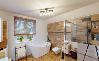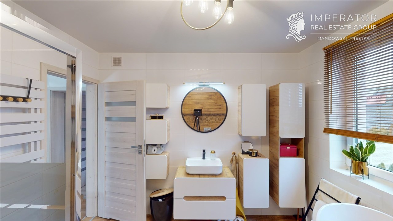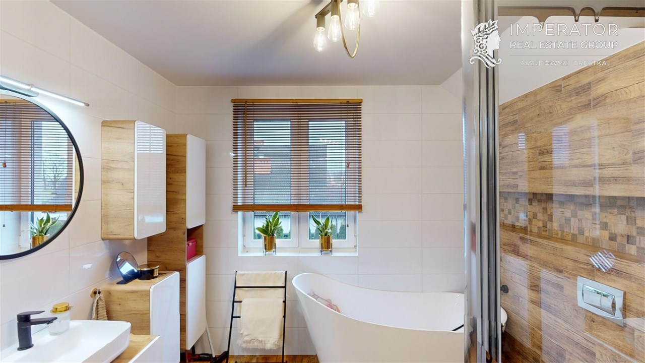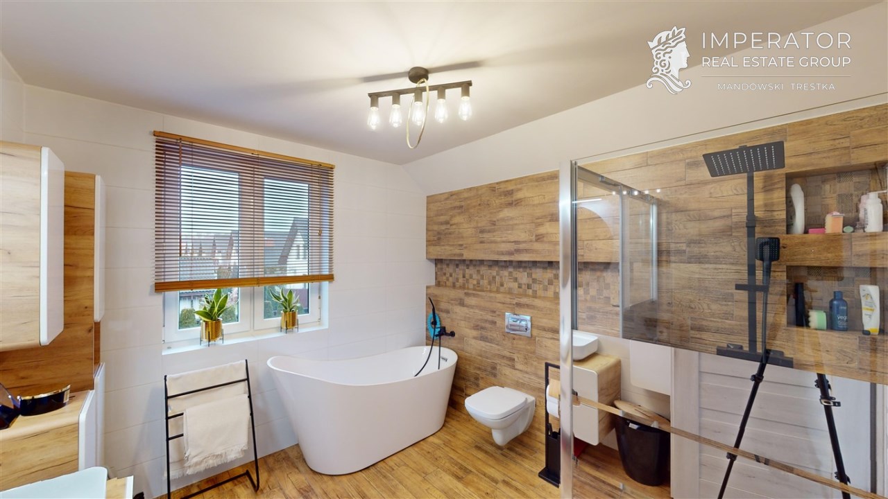 - ŁAZIENKA - z oknem; wyposażona w prysznic bezbrodzikowy, wannę wolnostojącą, podwieszane wc, lustro, umywalkę, liczne szafki