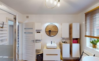 - SYPIALNIĘ z przejściem do GARDEROBY - dobrze wykorzystana przestrzeń wyposażona w liczne szafki, i miejsce do przechowywania ubrań czy prasowania