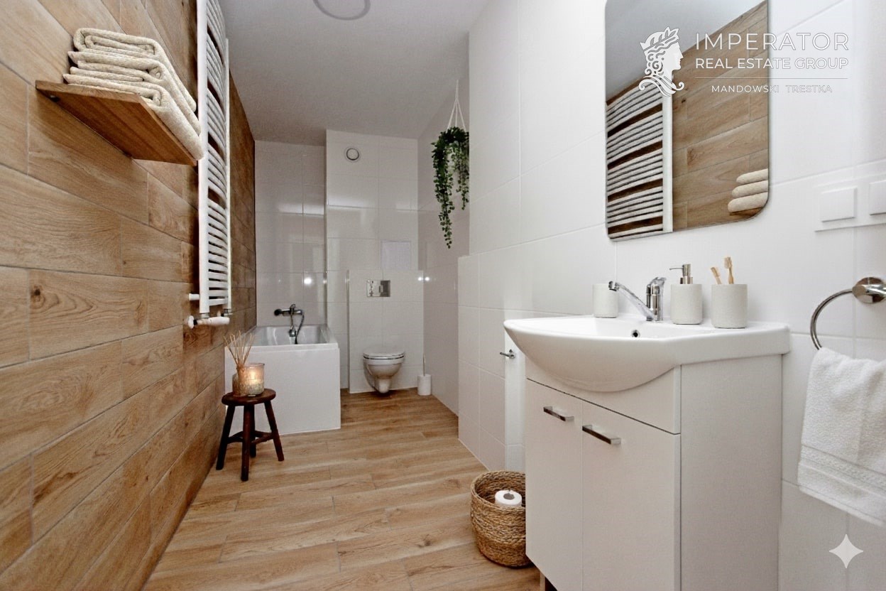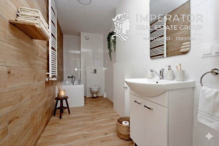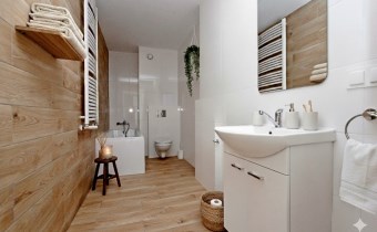 Na podłogach położone zostały panele podłogowe. Została poprowadzona pełna elektryka, a łazienki są już wyposażone w armaturę: wanna / prysznic, umywalka, krany, WC / bidet.