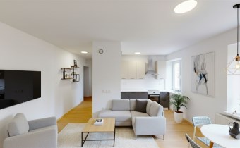 Zdjęcia salonu, pokoju i aneksu kuchennego przedstawiają możliwości aranżacji we własne meble i wyposażenie.