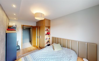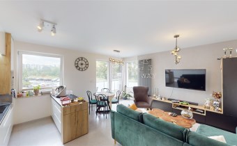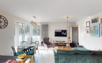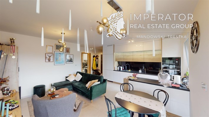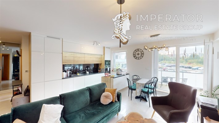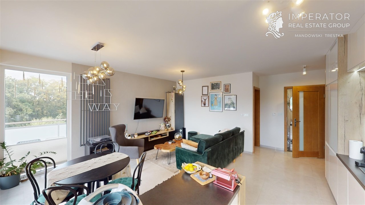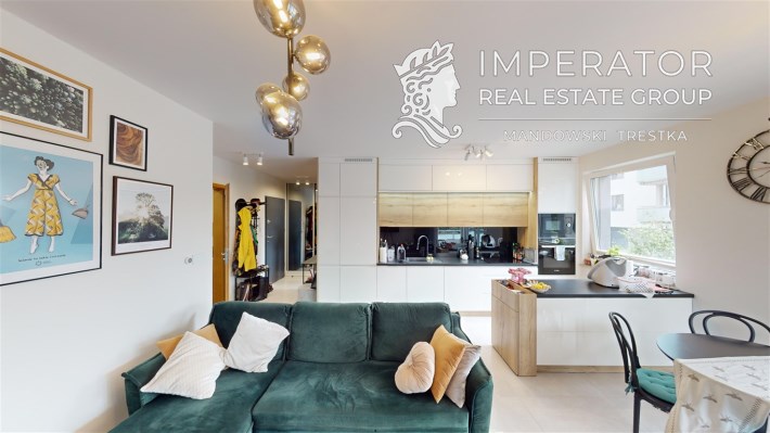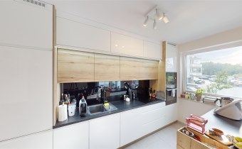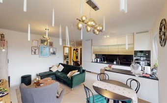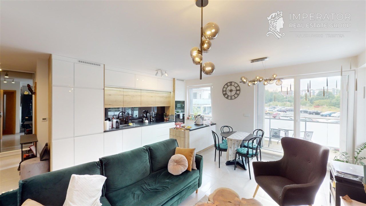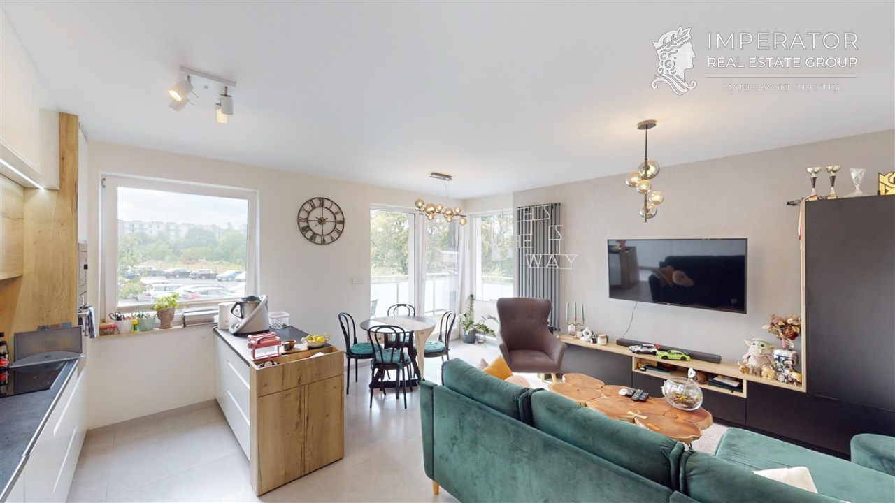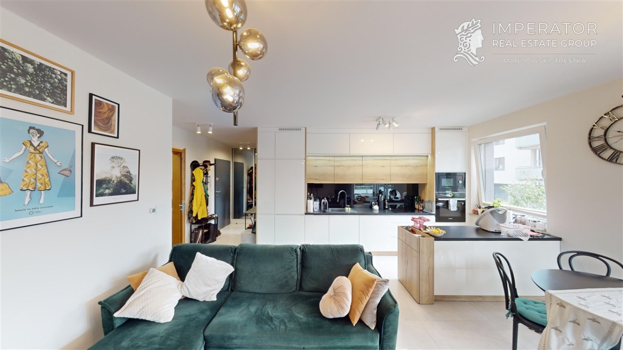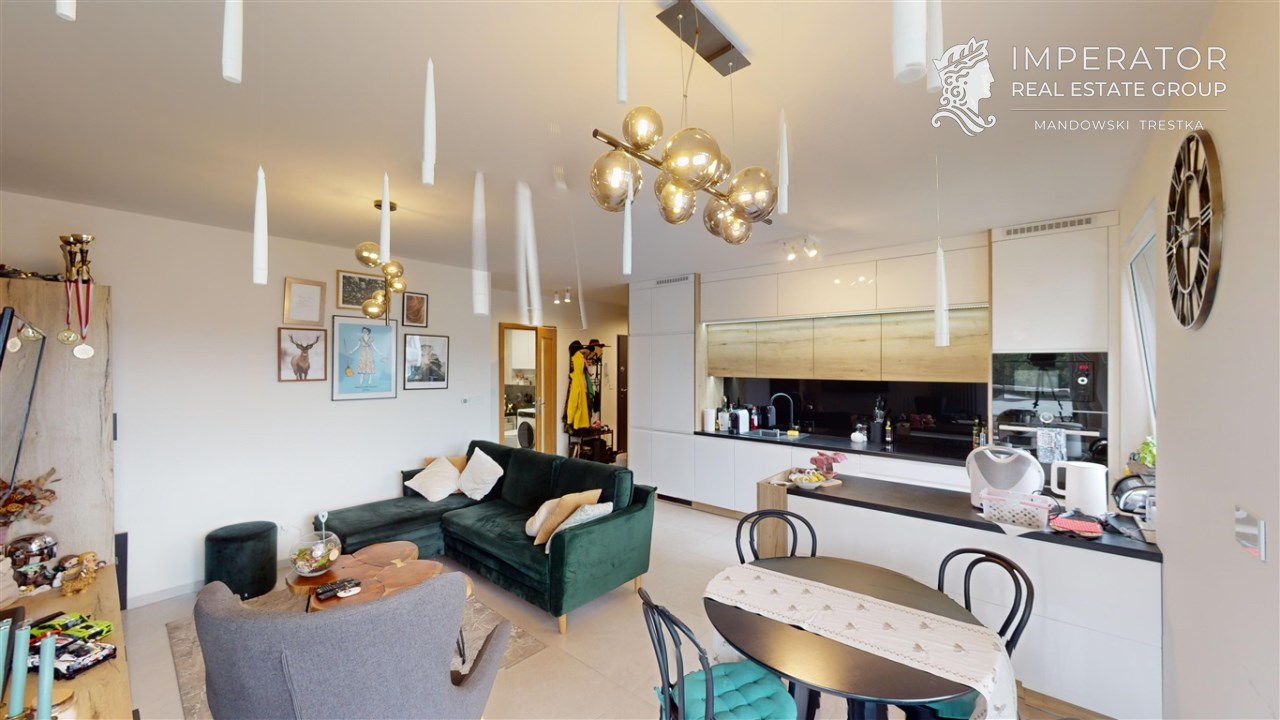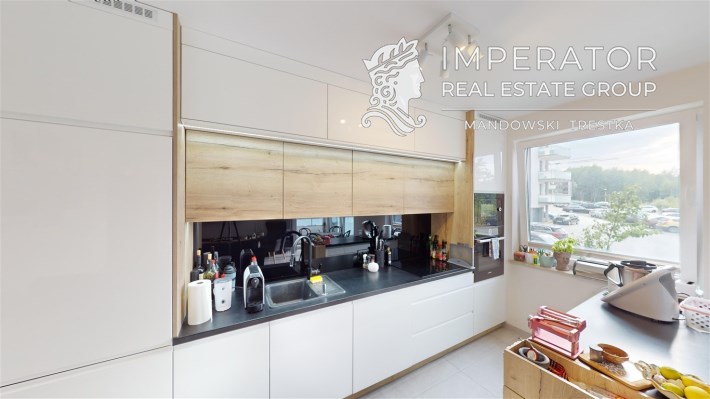- przestronny salon z aneksem kuchennym (z bezpośrednim wyjściem na taras) - kuchnia na wymiar, płyta indukcyjna, piekarnik, mikrofalówka, zmywarka zabudowana, zlew z baterią, zabudowana lodówka i zamrażalnik, mnóstwo przestrzeni do przechowywania;