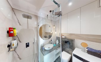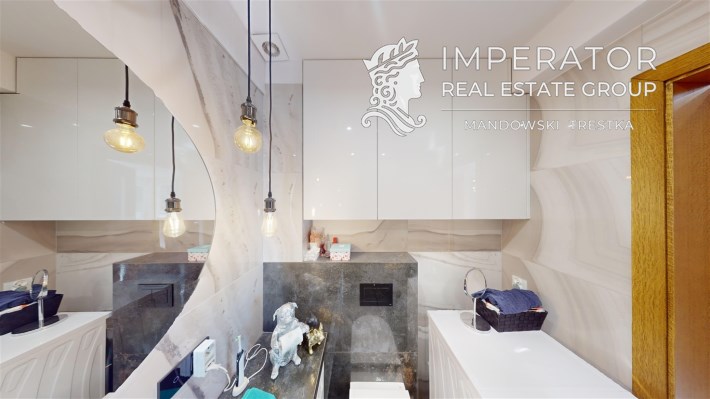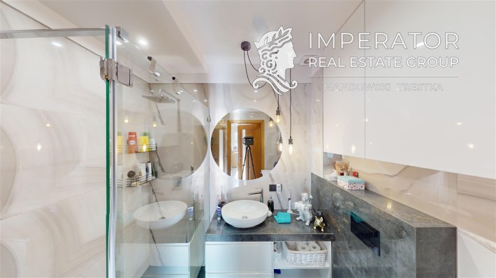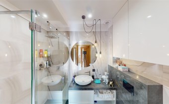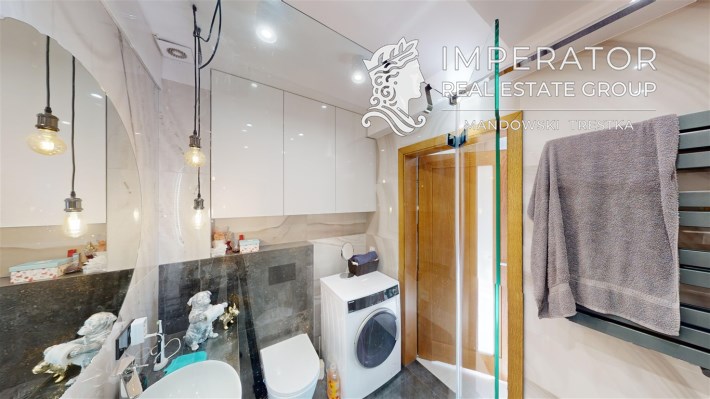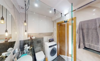 - łazienka z wc - wyposażona w prysznic walk-in z deszczownicą, umywalkę z szafką, pralkę, wc oraz dużo przestrzeni do przechowywania