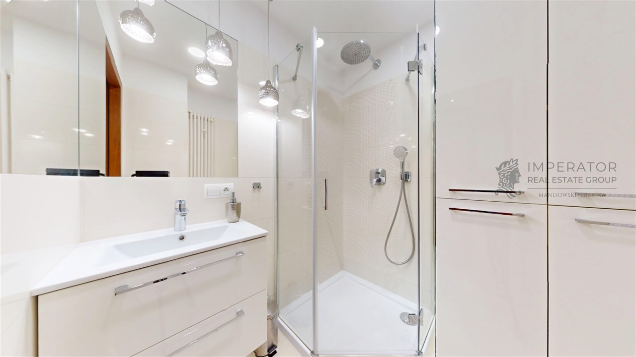 - ŁAZIENKA, w której znajduje się duży prysznic, umywalka z szufladami, duża zabudowana szafka łazienkowa z pralką, koszem na pranie i półkami, duże lustro dodatkowo podświetlane.