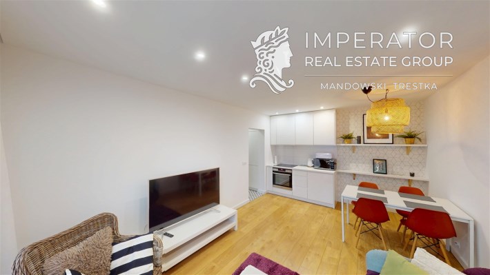 - Salon z aneksem kuchennym – przestrzeń dzienna, pełne wyposażenie