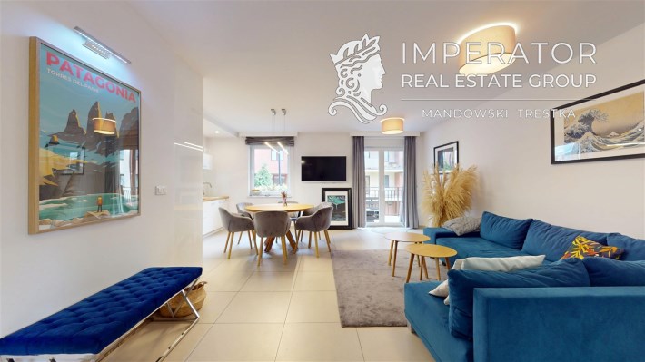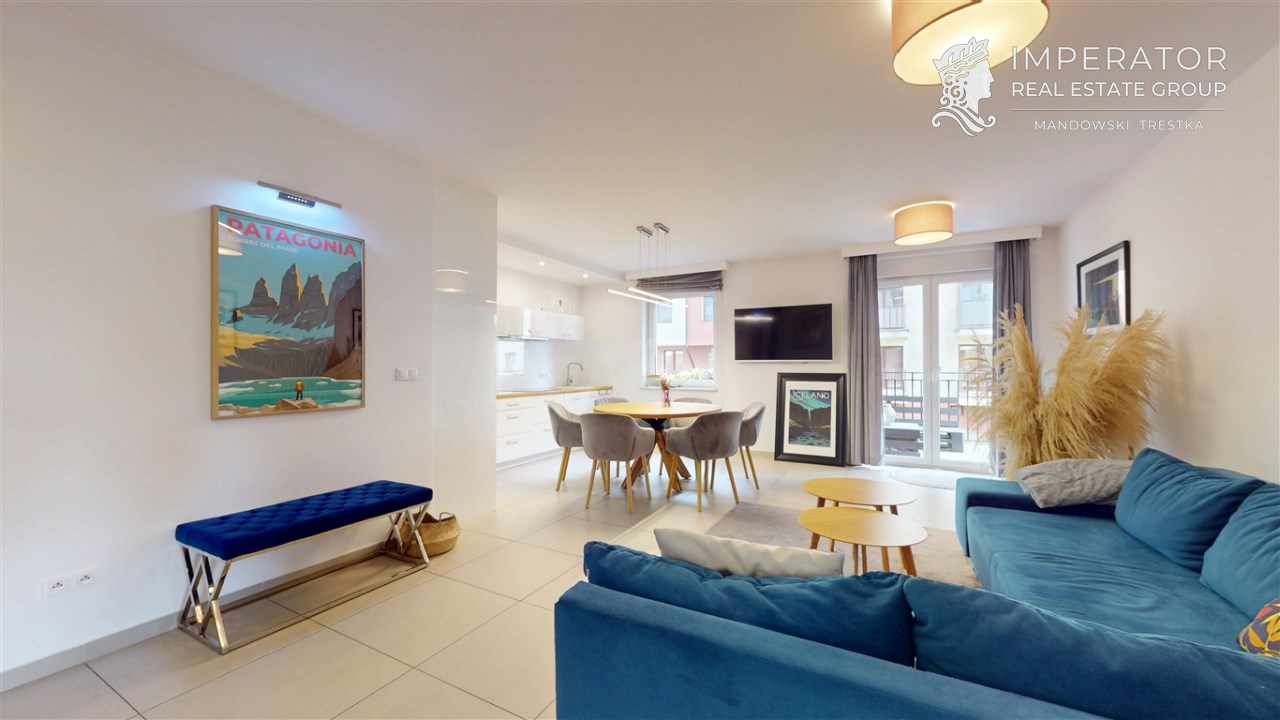 • Ogromny i komfortowy salon z kuchnią: miejsce wypoczynku, duża sofa narożnik, TV, balkon z wypoczynkiem ogrodowym